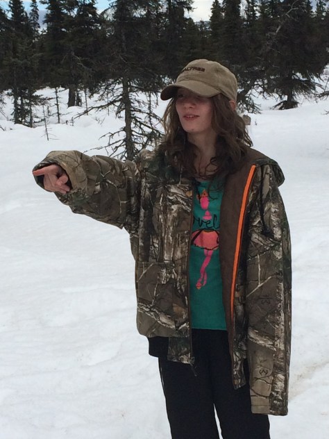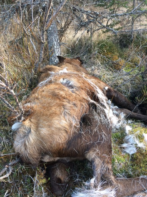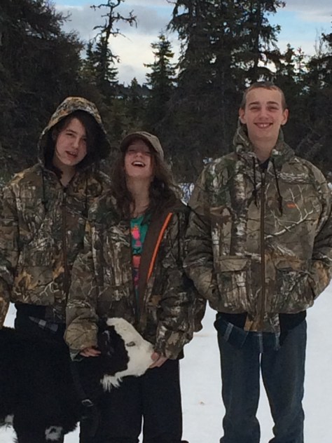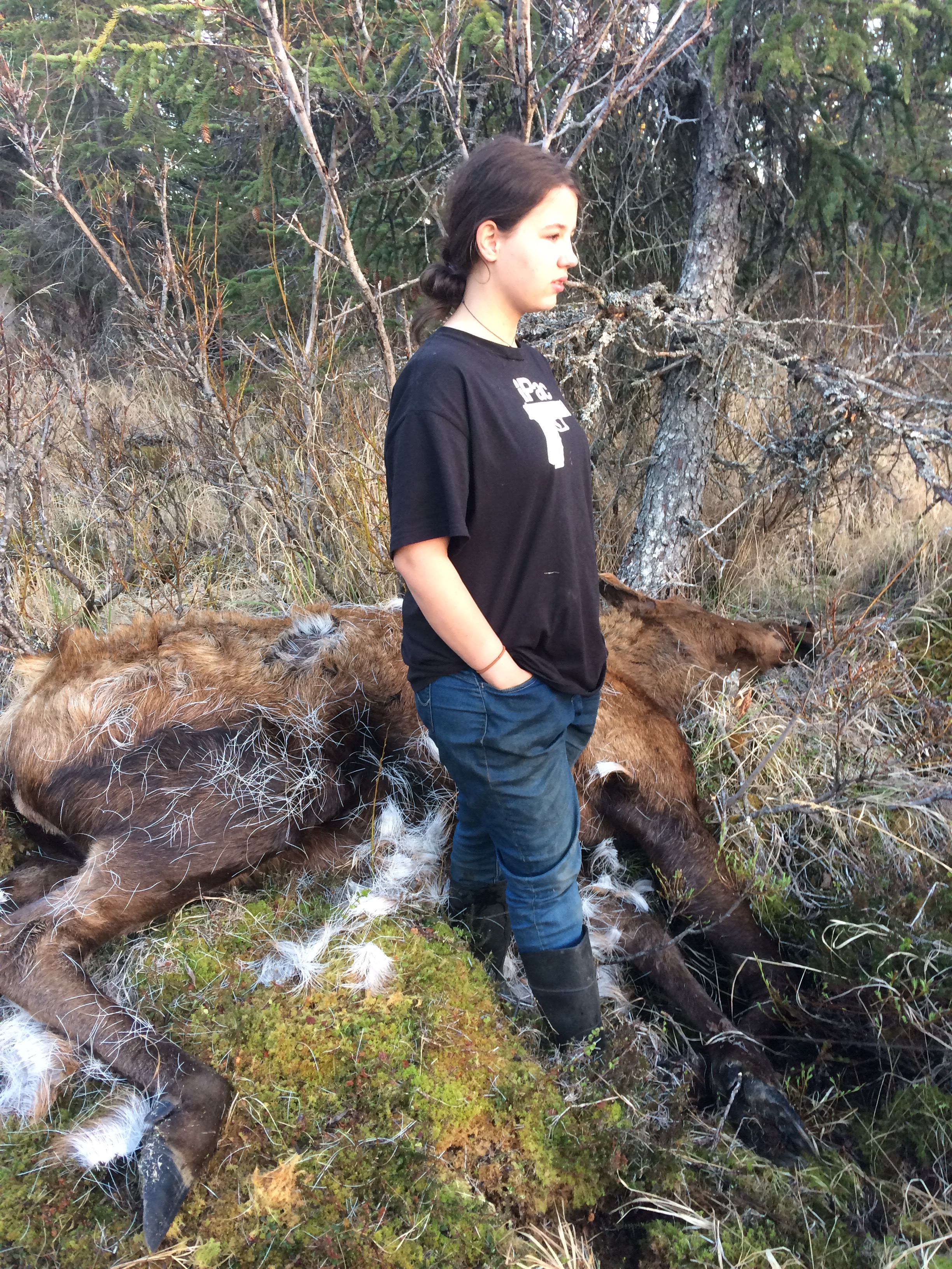 Finally arriving at the truck, a mile until we reach a real road, 6 miles to the turn off the troopers said to take and only a 1/4 mile hike to the prize…..right! The first of the instructions were spot on, the 1/4 mile hike not so correct. It was more like a mile through a gravel pit, over a couple of hills and down a draw next to a huge water hole but we were there and The prize was a huge cow Moose. The reason she was available is she decided a hiker was a great punching bag. Sad, but that’s what momma Moose do when they have babies. Poor guy going for a hike felt terrible he had to protect himself and after seeing her 2 orphan babies I felt bad too but her death would not be in vain, she will feed several families.