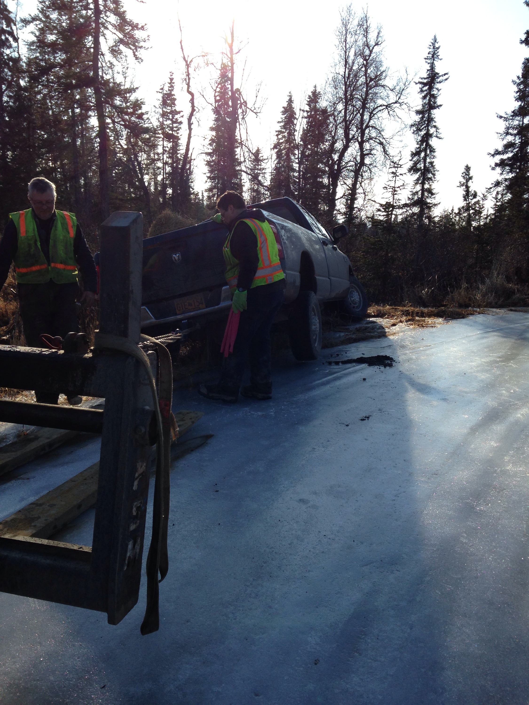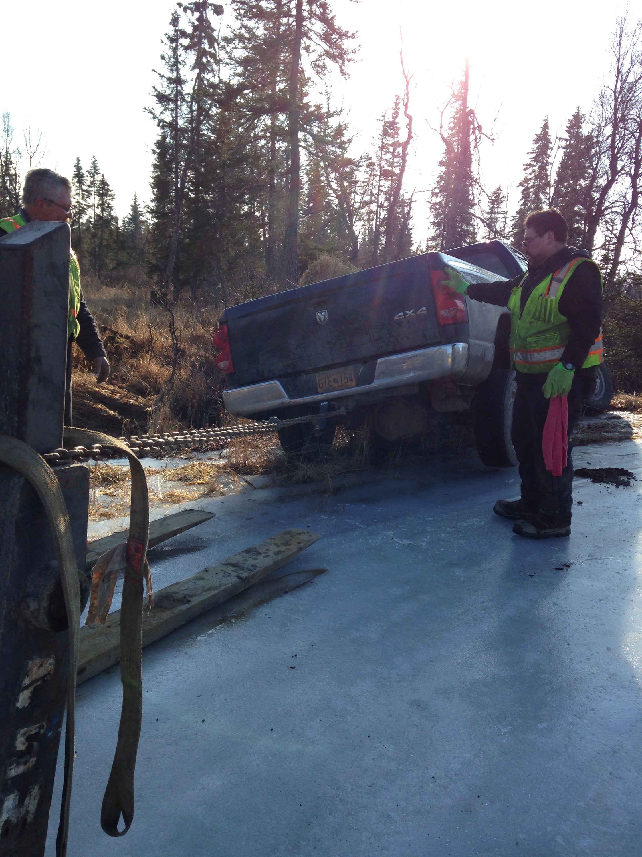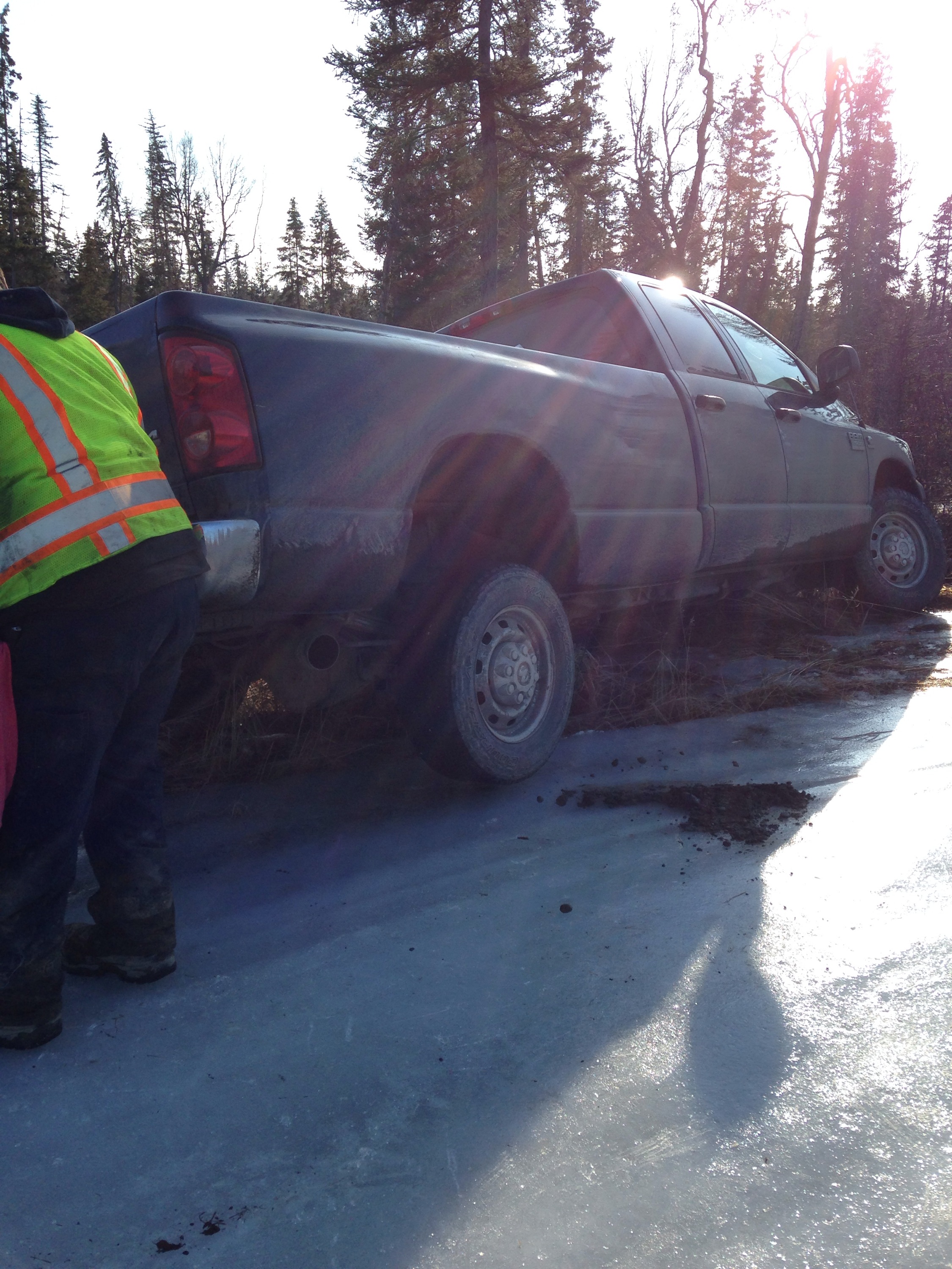 I managed to right myself then walk back to the gas plant where two very nice men came to my rescue with a big beautiful loader. After they chained the truck to the loader and made sure it wasn’t going to roll they had me crawl back in, over the gear shift and other things that can get in the way of boots with ice cleats on them, I finally got in the drivers seat and got it in nuetral. It was about this time dear hubby arrives (I had called him to let him know I was a little delayed. He pulls up and remarks-boy you almost done it that time! Ya think? Was the only thing I could respond with. He also made a couple remarks I chose to ignore about the truck seat and potential stains but that’s as far as we are going with that.