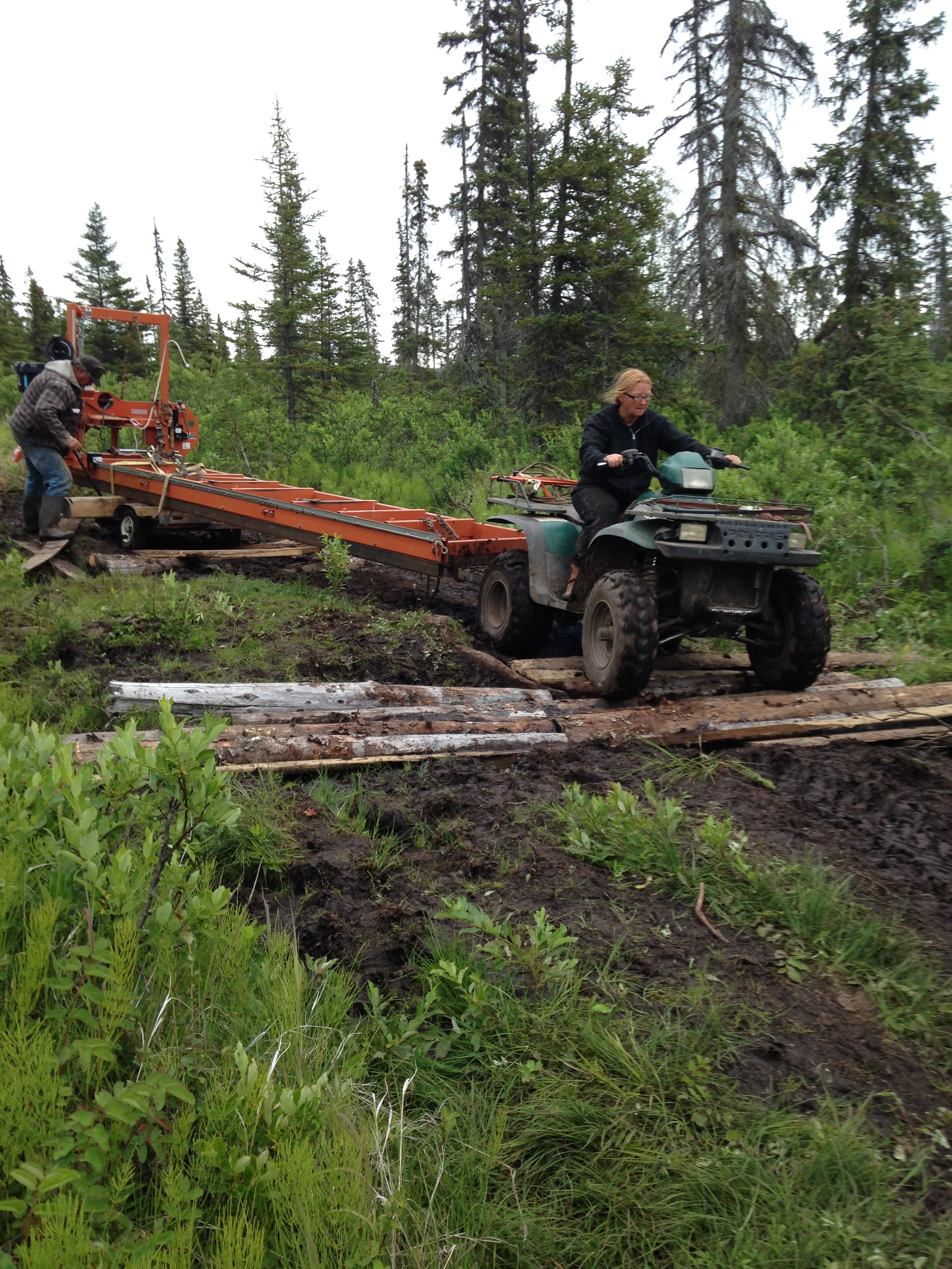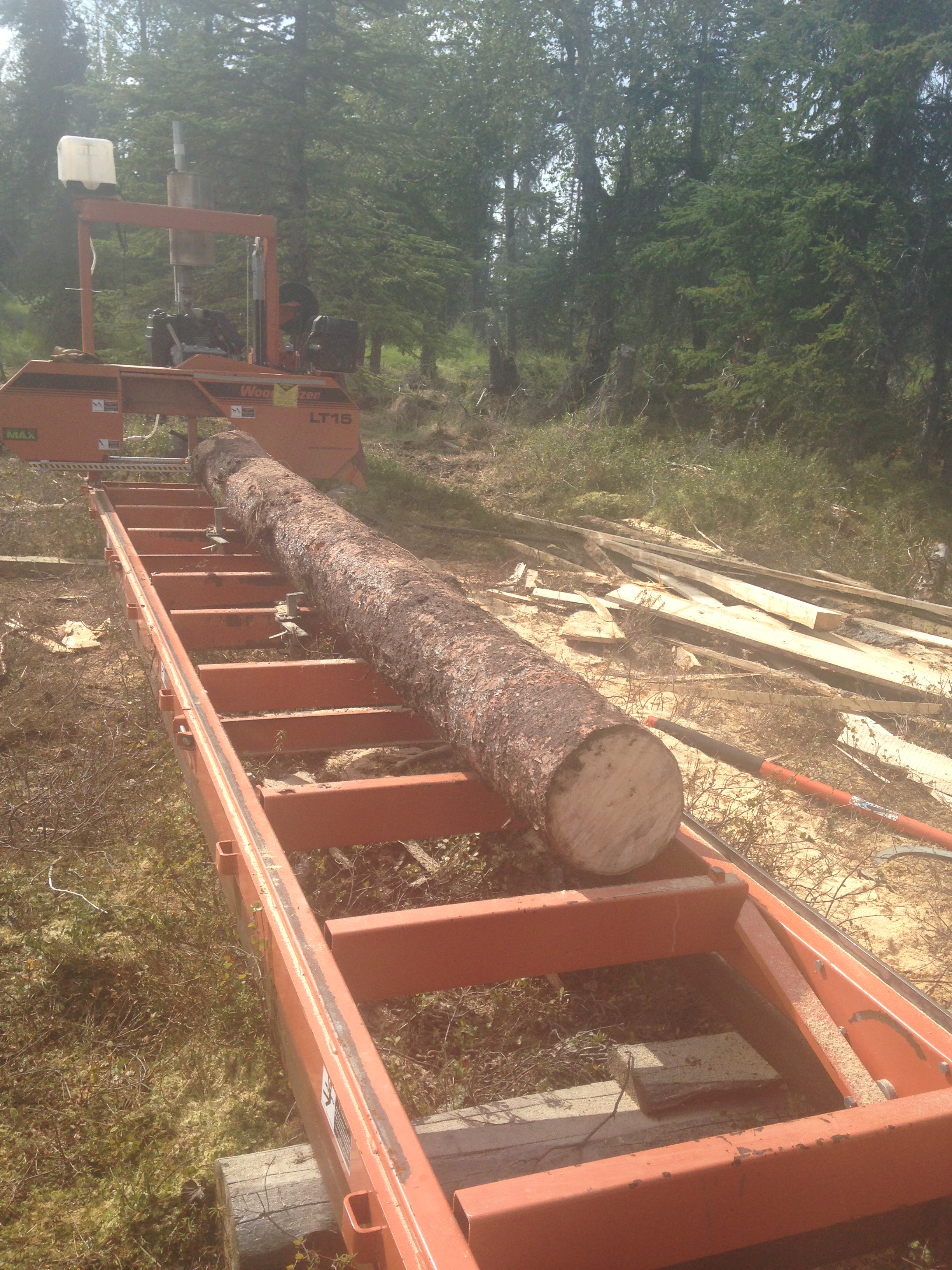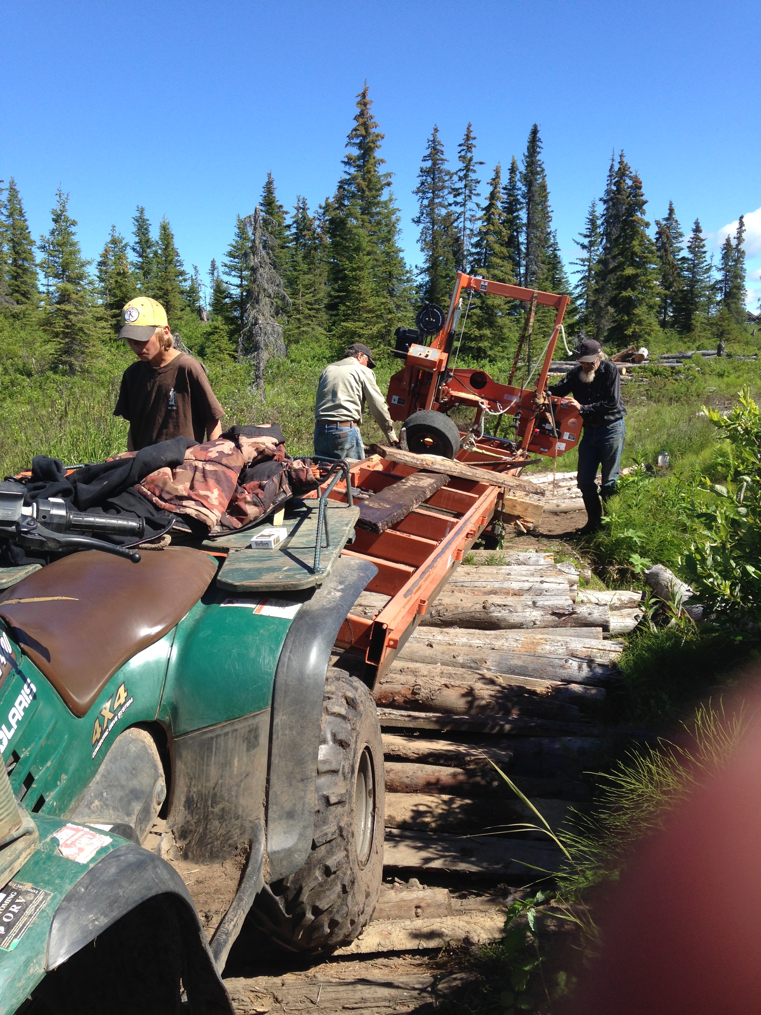 This summer it rained almost every day. We were in a cabin with a canvas and plastic roof until mid September when it finally dried out enough to put a real roof on and it was quite the project. First we needed to get the sawmill closer to home. This was a major ordeal considering we had over 30 inches of rain in 3 weeks but with a little ingenuity and a lot of hard work we finally got it in and set. Then we had to haul logs which were then milled into lumber. Finally with lumber cut we all pitched in and the framework began.
