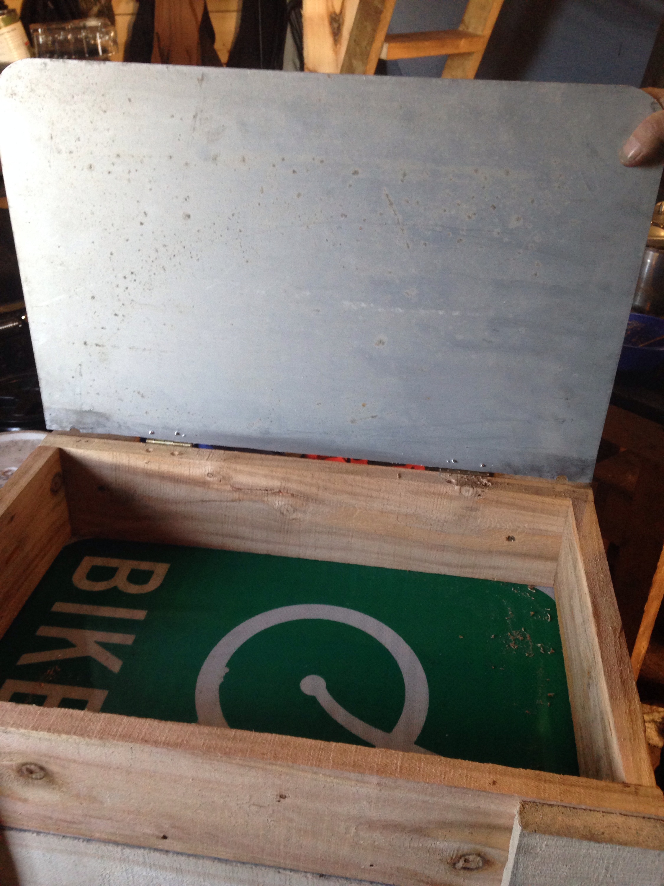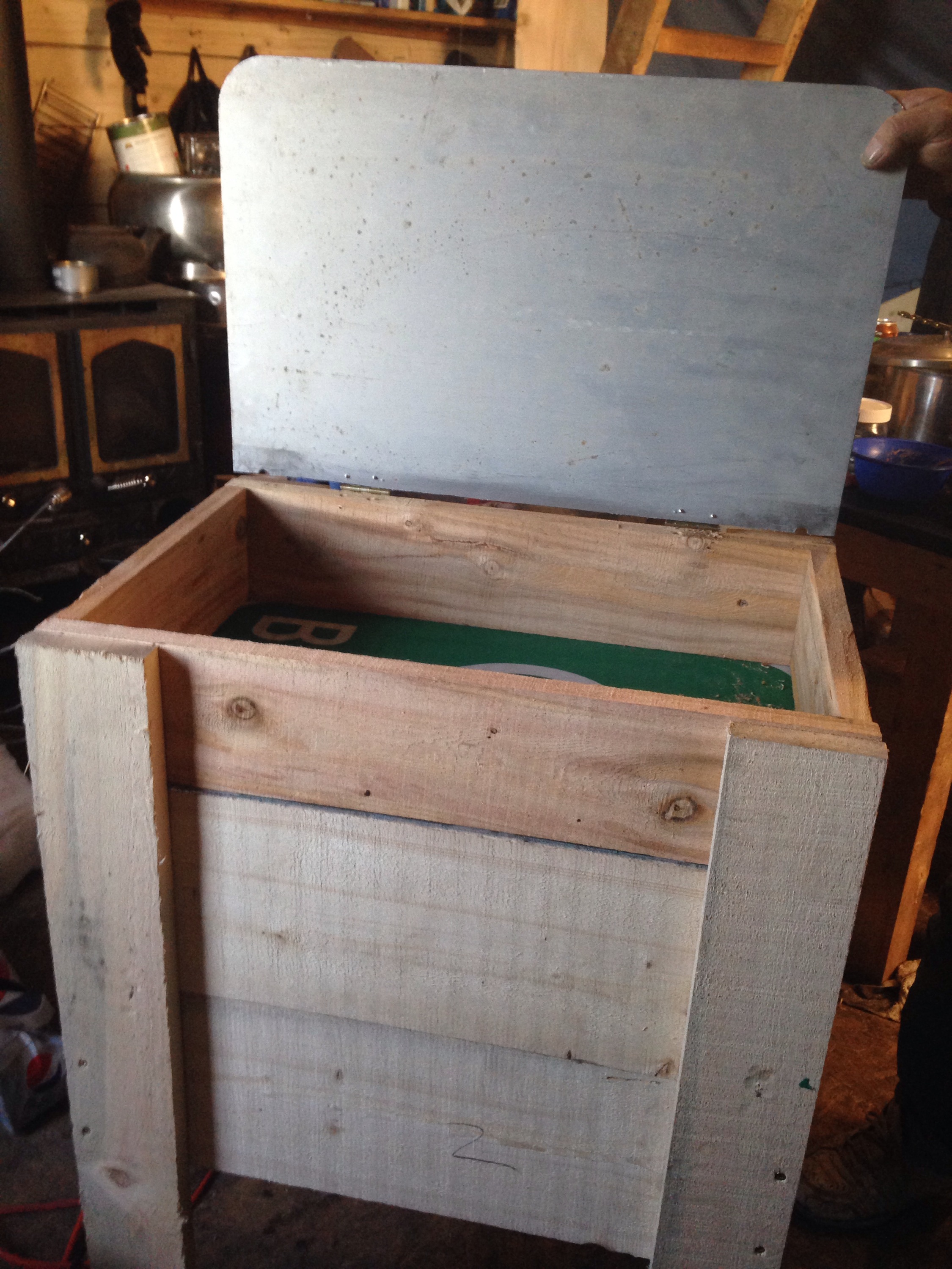 It’s really a very simple design. Build a box 3 foot square 9″ high and for the bottom attach a metal plate (we used old highway signs I picked up at the dump the other day (when I hauled them in posts and all hubby was questioning it but ha! they were useful!!!) Attach leg to sides, then add boards around the bottom to hold heat in from below that is supplied with an oil lamp, add a cover that will keep the heat contained then put 1/2 inch to 1 inch of sawdust down to disperse heat and cover with either straw or hay. It is currently a toasty 95 in the middle and 80 on the sides. To raise or lower temp you just raise or lower the lamp. Not a difficult thing to do and non electric. Sure beats having to maintain a brooder very 2 hours with my first design.