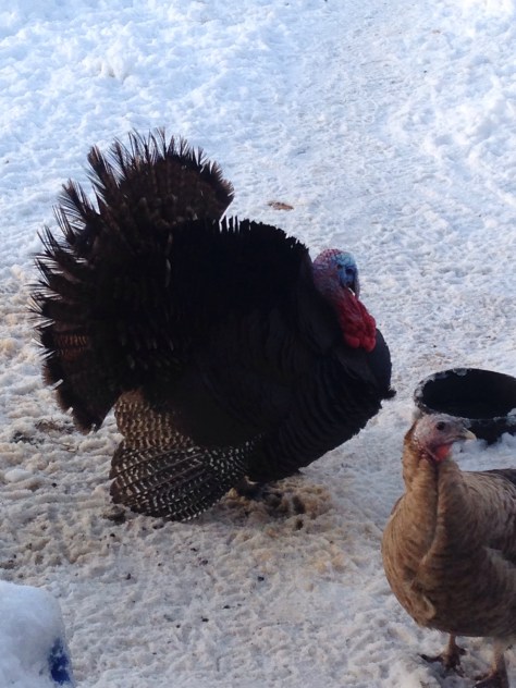 Our Tom turkey has decided it must be spring and is courting the ladies…..and my dog. Tommy has found an attraction to poor Missy who isn’t at all interested. Missy used to love to play outside and they had a little game of tag they would play-she would chase him and hit him with her paw and he would then turn to chase her and give her a little peck. They would do this for hours then settle down beside each other to sun themselves and rest. It was cute and amusing until the weather turned warm again and Toms hormones kicked in. It started out simple enough, Missy thought it was just a new game. Tom would strut and fluff up then circle her and they would spin in a circle but then…..It  happened…… Tom decided to consummate the relationship and Missy being a nice girl was giving no free “rides”. Poor Missy won’t even venture outdoors if he is in the vicinity so he struts in front of the steps for her. Unrequited love.